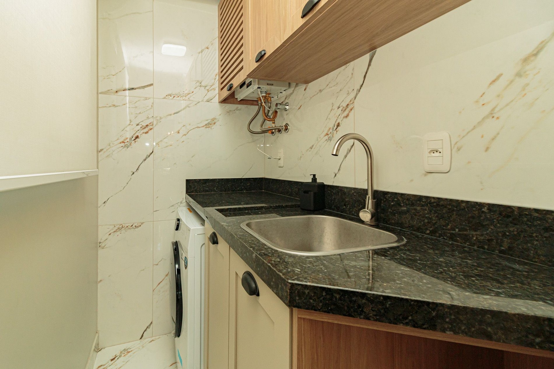 Cozinha equipada com todos os utensílios e eletrodomésticos para refeições em casa.