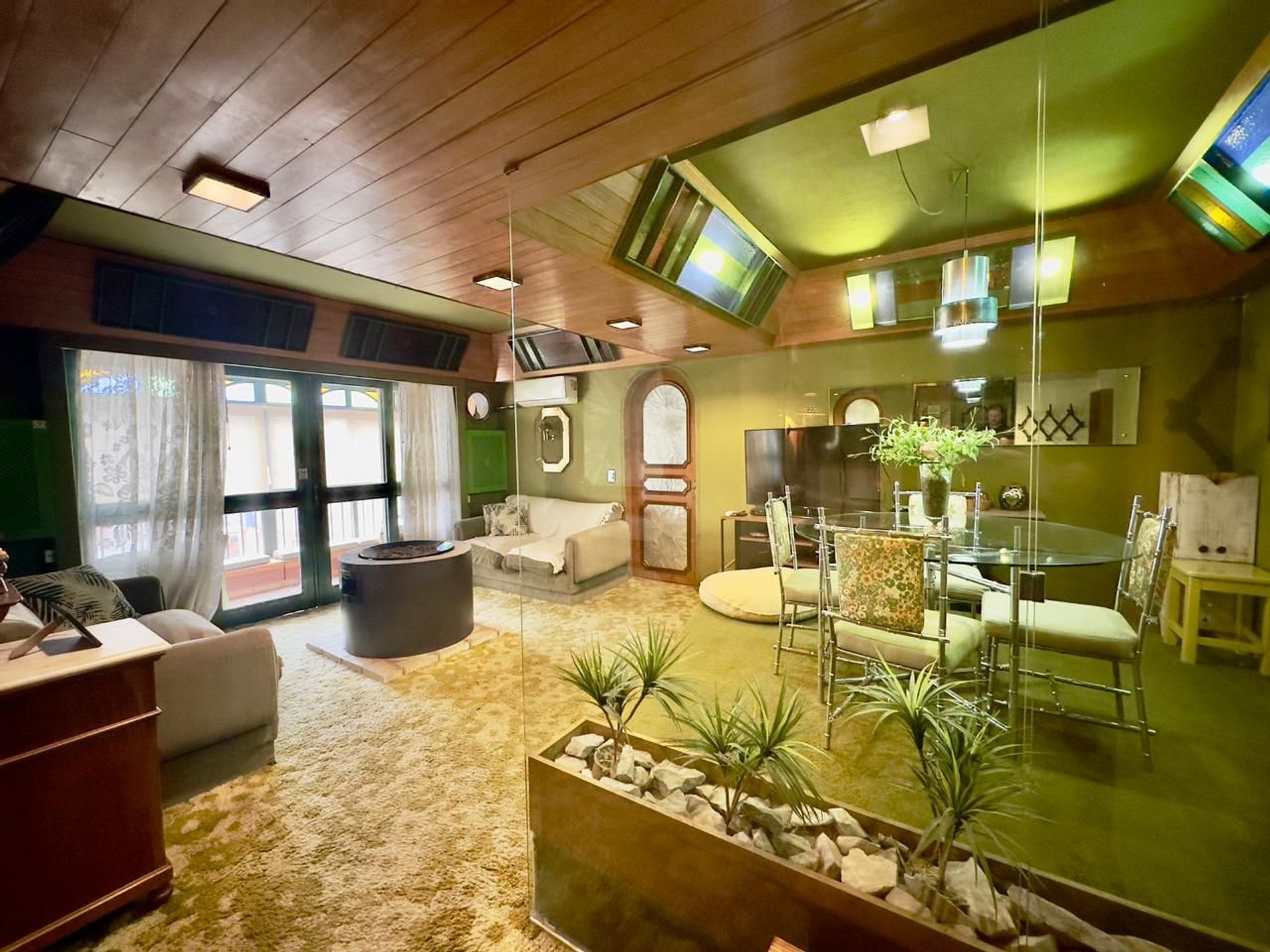 Este aconchegante apartamento distribuído em 4 dormitórios conta com excelente iluminação natural, proporcionando um ambiente interno agradável e confortável. A decoração retro adiciona um charme especial, tornando sua experiência única. O piso e as paredes da sala de estar são revestidos com carpete, criando um ambiente acolhedor e de fácil manutenção.