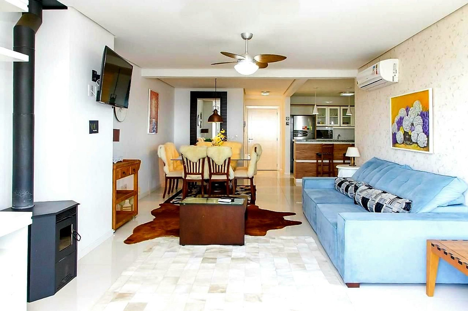 Uma confortável sala de estar com ar condicionado (quente e frio), TV com controle, mesa com 8 cadeiras e Lareira;