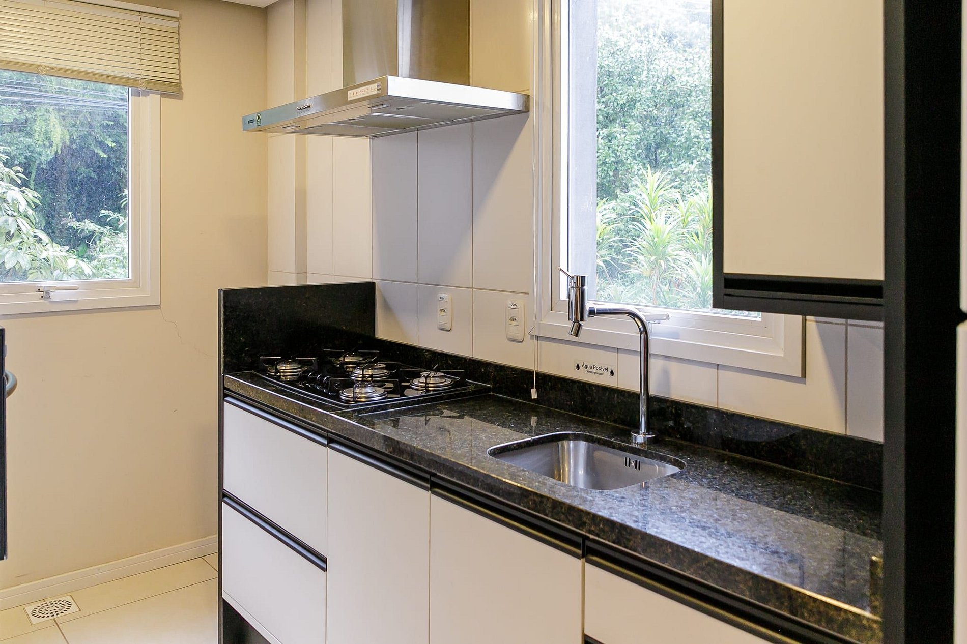 Cozinha completamente equipada com eletrodomésticos modernos, cafeteira, sanduicheira, grelha...;