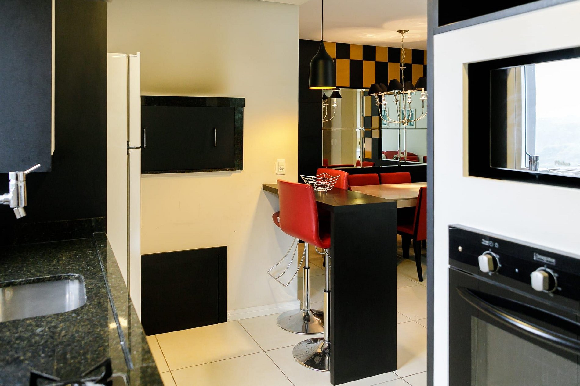 Cozinha completamente equipada com eletrodomésticos modernos, cafeteira, sanduicheira, grelha...;