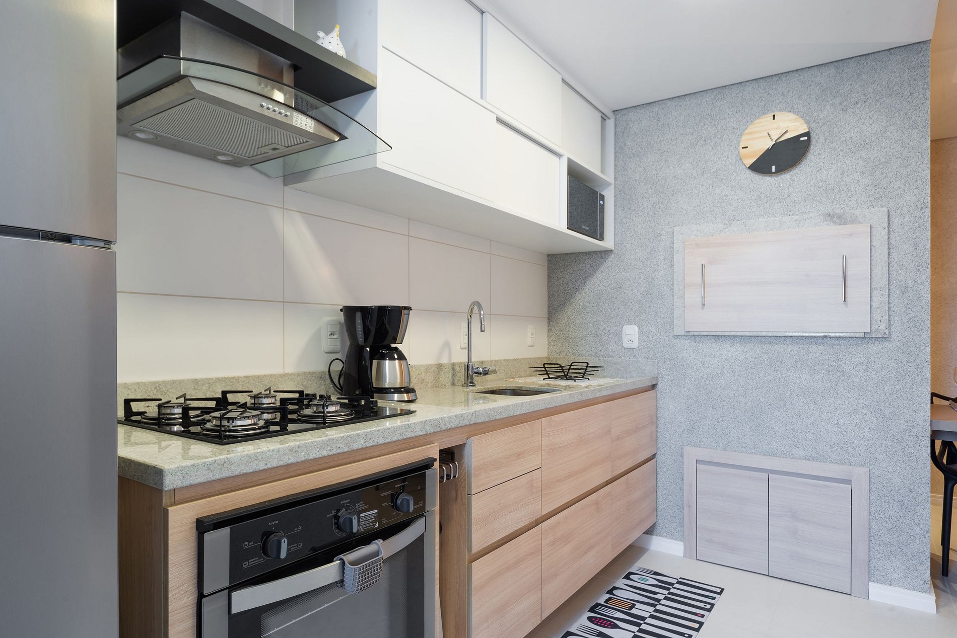 Cozinha completamente equipada com eletrodomésticos modernos e uma churrasqueira;