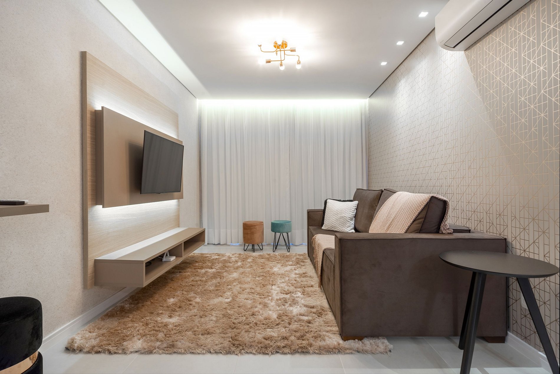 Uma confortável sala de estar com sofá-cama de casal, ar condicionado (quente/frio) e TV Smart;