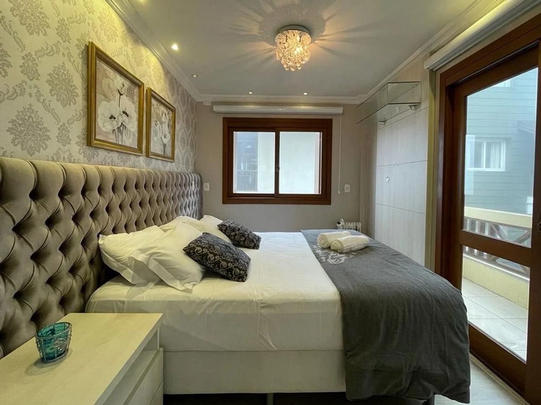 01 quarto com cama de casal frente para sacada, finamente decorado;