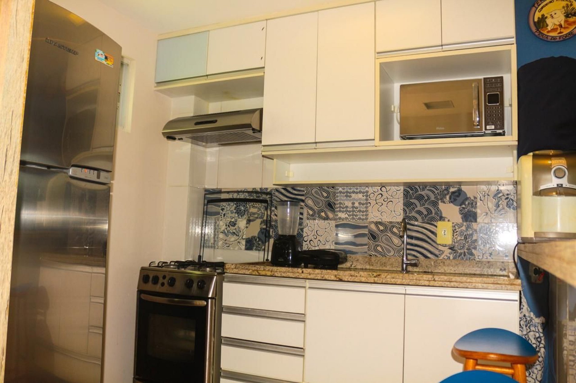 Cozinha equipada com fogão, forno, micro-ondas e geladeira