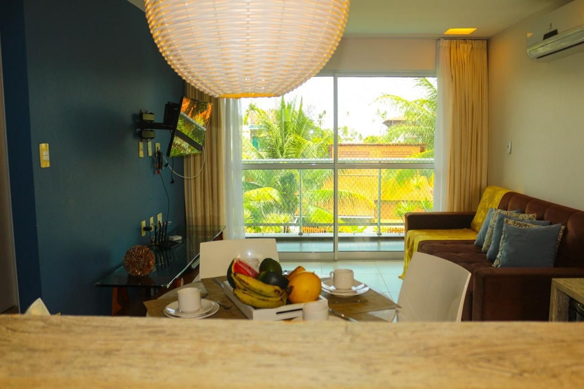 O apartamento fica no terceiro andar, com vista para o nascer do sol. Conta com sala, cozinha totalmente equipada e varanda com vista para a área da piscina. São dois quartos: o principal com cama queen, o segundo quarto com quatro camas individuais, além de um sofá-cama na sala. Também possui dois banheiros completos e vaga de garagem exclusiva.